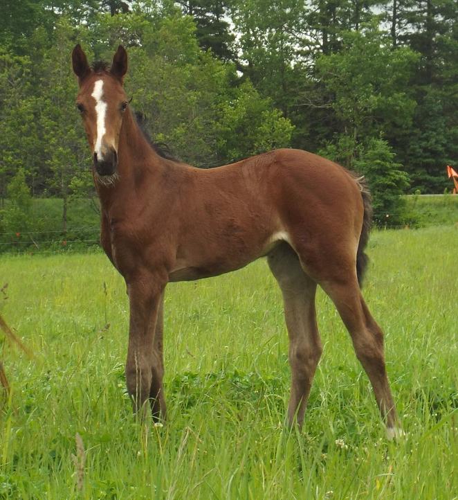 4) Bonheur x Esprentina NPF: HV Born July 7th. Dark Bay colt with a star and snip, white hind socks, and some white on front left.