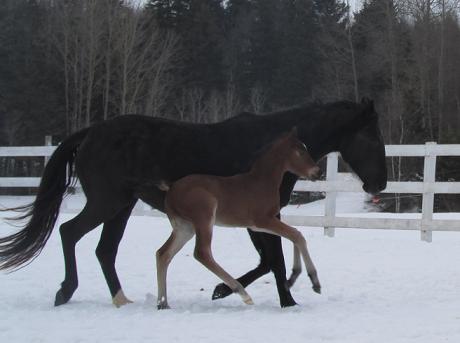 We have two new fillies joining the farm in the winter of 2016. One is Bellmora (Bonheur/Patras V. Rappenhoff/Rio Grande) bred by Leslie Melvin of Summit Hanoverians. The other was a bit of a surprise lol: Lantina was carrying a sneaky embryo after having been flushed and also having been short-cycled. This second filly is by Schwarzenegger and has been named Saga and was bred by us here.