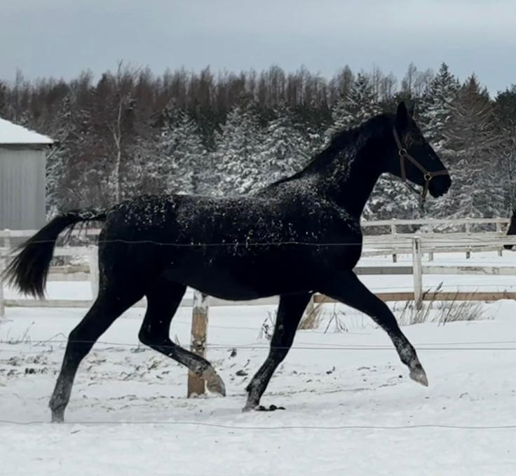 Big boned powerhouse. This is an interesting gelding that takes after his dam sire, Totilas. Canter is uphill He can rock right back and sit. Trot has tons of push and more knee/hock action.